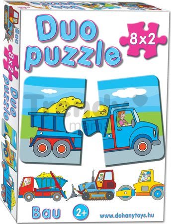 Baby puzzle pre deti Duo Pracovné autá sú krásne detské puzzle s motívom stavbárskych áut a mechanizmov. Motív týchto puzzle pre najmenšie deti sú stavebné autíčka: buldozér, nákladiak, bager a podobne. Balenie puzzle obsahuje 8x2 dieliky. Puzzle sú vhodné pre vekovú kategóriu od 24 mesiacov. Puzzle pre najmenšie deti po poskladaní tvoria osem výrazných a farebných obrázkov, zložených z dvoch dielikov, ktoré zaujmú každé dieťa, no najmä malých chlapcov. Puzzle sú vyrobené z kvalitného a odolného materiálu a spĺňajú bezpečnostné štandardy, sú teda pre deti bezpečné.