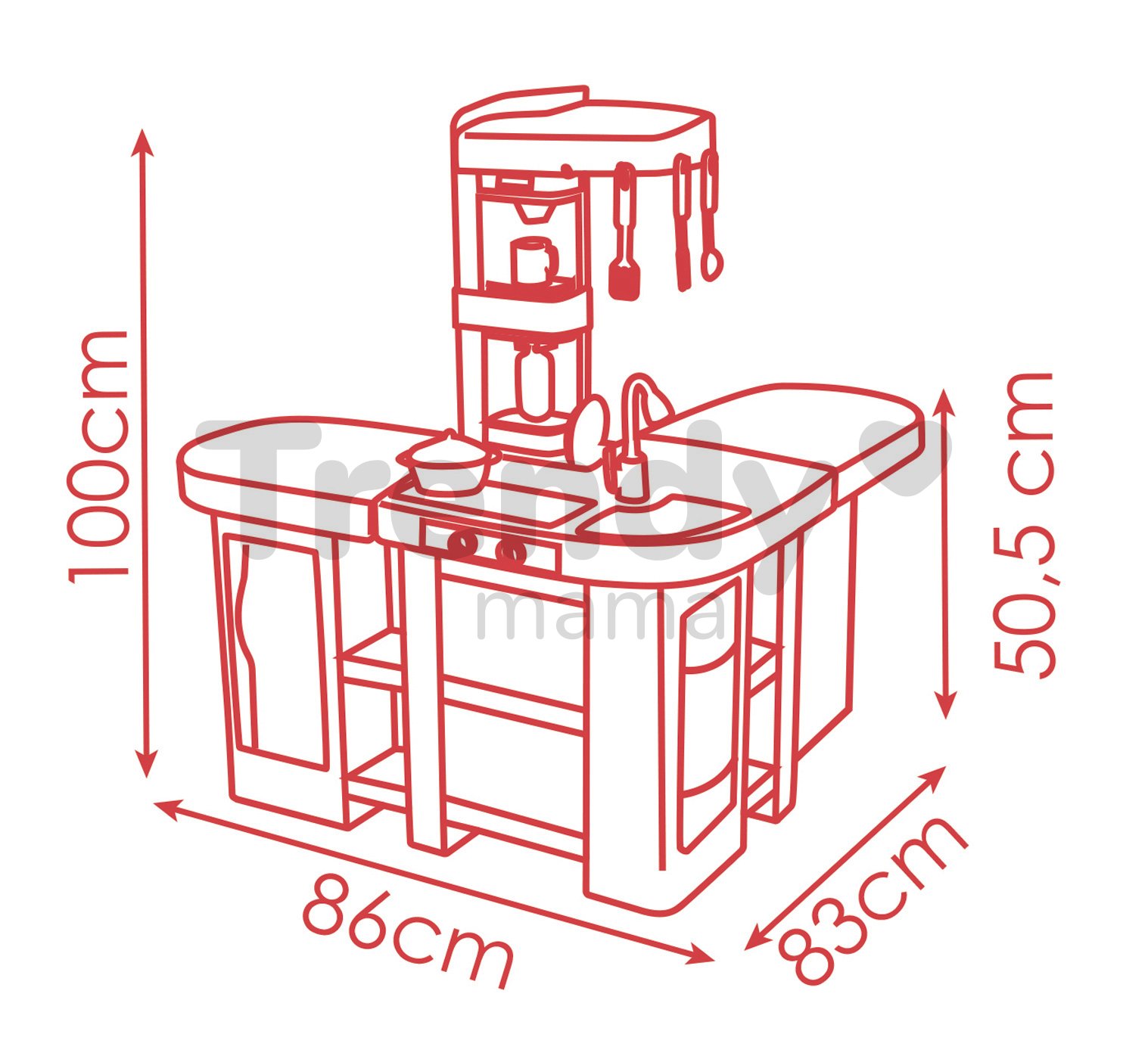 Bucătăria electronică pentru copii este bazată pe suport stabil iar dimensiunile totale ale bucătăriei sunt 26*83*100 cm. Înălțimea totală a bucătăriei este de 100 cm, înălțimea suprafeței de lucru de la pământ este de 51 cm. Datorită căreia fiecare părinte va putea decide dacă înălțimea suprafeței de lucru corespunde bucătarului mic. Bucătăria este ușor de accesat din toate părțile și în plus spatele bucătăriei este acoperită cu inscripții și motive frumoase. Bucătăria Tefal Studio XXL Smoby funcționează cu baterii, care permit joaca dacă sunt puse la locurile corespunzătoare.