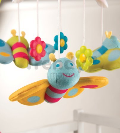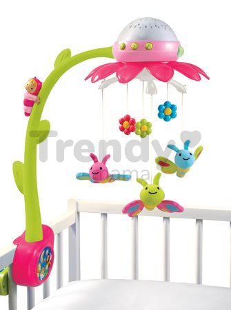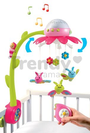 Caruselul Flower Cotoons Smoby care se pune deasupra pătuţului, este o jucărie minunată, multifuncțională, potrivită pentru toți copii de la 0 luni. Acesta, se poate ataşa uşor de colţul pătuţului cu șurub, care se adaptează la grosimea pătuțului. Caruselul este în formă de floare în culori verde cu roz. Acest cărucior unic îi ține compania copilului dvs. și redă 4 melodii diferite. Caruselul proiectează flori și fluturi pe tavan, lumina ambientală, calmează bebelușul iar culoarile se schimbă. Caruselul include o telecomandă și datorită acesteia, copilul nu se trezește când este pornit sau oprit. Floarea are câteva frunze din plastic pe tulpina sa, și de asemenea, un personaj de basm din seria populară Cotoons Smoby. De floare sunt atârnate diverse jucării colorate care se învârt deasupra capului bebelușului.