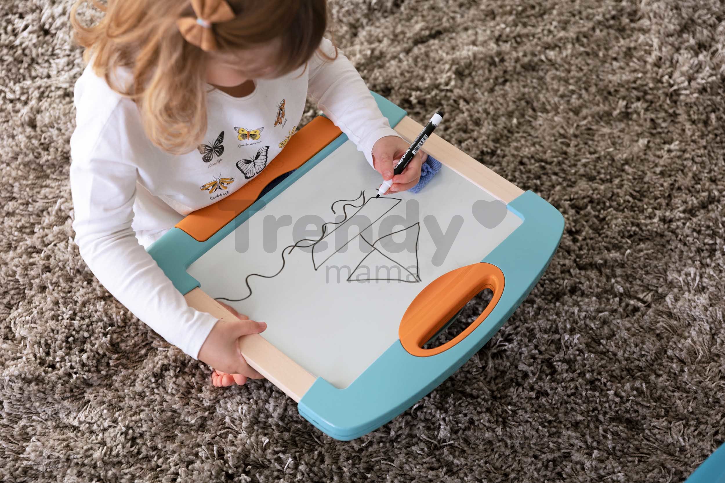 Prenosný tablet na kreslenie Travel Slate od francúzskeho výrobcu Smoby predstavuje vynikajúci darček pre všetky tvorivé deti od 3 rokov. Detský tablet umožní deťom kresliť si obrázky, precvičovať si písanie abecedy alebo riešiť prvé matematické úlohy. Modulárny tablet je vyrobený z kvalitného dreva a pevných plastov, vďaka čomu sa dá ľahko prenášať a deti si ho môžu vziať aj na návštevy ku kamarátom a rodine. Tablet využijú aj v pohodlí domova, kedy sa dá jednoducho rozložiť s opierkou v jeho zadnej časti. Spodná časť tabletu je vybavená priehradkou pre uloženie kresliacich potrieb.