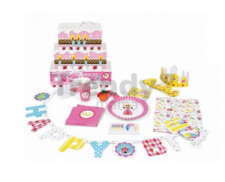 Detská narodeninová sada Princess Happy Janod s princezničkami poteší každú malú oslávenkyňu vo veku od 3 do 8 rokov. Praktické balenie v podobe ružovej narodeninovej torty so sviečkami v sebe ukrýva 61 doplnkov, ktoré nesmú chýbať na žiadnej detskej narodeninovej oslave. Krásne princezné a kombinácia pestrých farieb zdobia papierové taniere, poháre, čiapky pre hostí, pozvánky, balóniky či obrus. Chýbať nesmú ani farebné sviečky na tortu, veľký nápis “Happy Birthday” a realistická papierová korunka, s ktorou sa bude každé dievčatko cítiť ako naozajstná princezná.