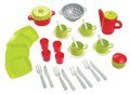 Setul de prânz 100% Chef pentru copii conține în total 35 de accesorii, moderne care sunt piesele nelipsite al bucătăriei de joacă. Accesoriile sunt: 4 cești verde cu farfurie mică, 4 farfurii verzi moderne în formă pătrată, 4 pahare roșii, set de tacâmuri pentru copii de culoarea argintiu, strecurător pentru paste de culoarea argintiu, vas roșu cu capac verde, ceașcă mare roșie pentru ceai, suport mic pentru zahăr cu capac roșu. Fiecare piesă din set se asortează bine de celălalt și devine un set de prânz superb. Cu acest set de prânz copii dumneavoastră învață mai repede pregătirea mesei în mod corect și de a folosi corect vasele din bucătărie.