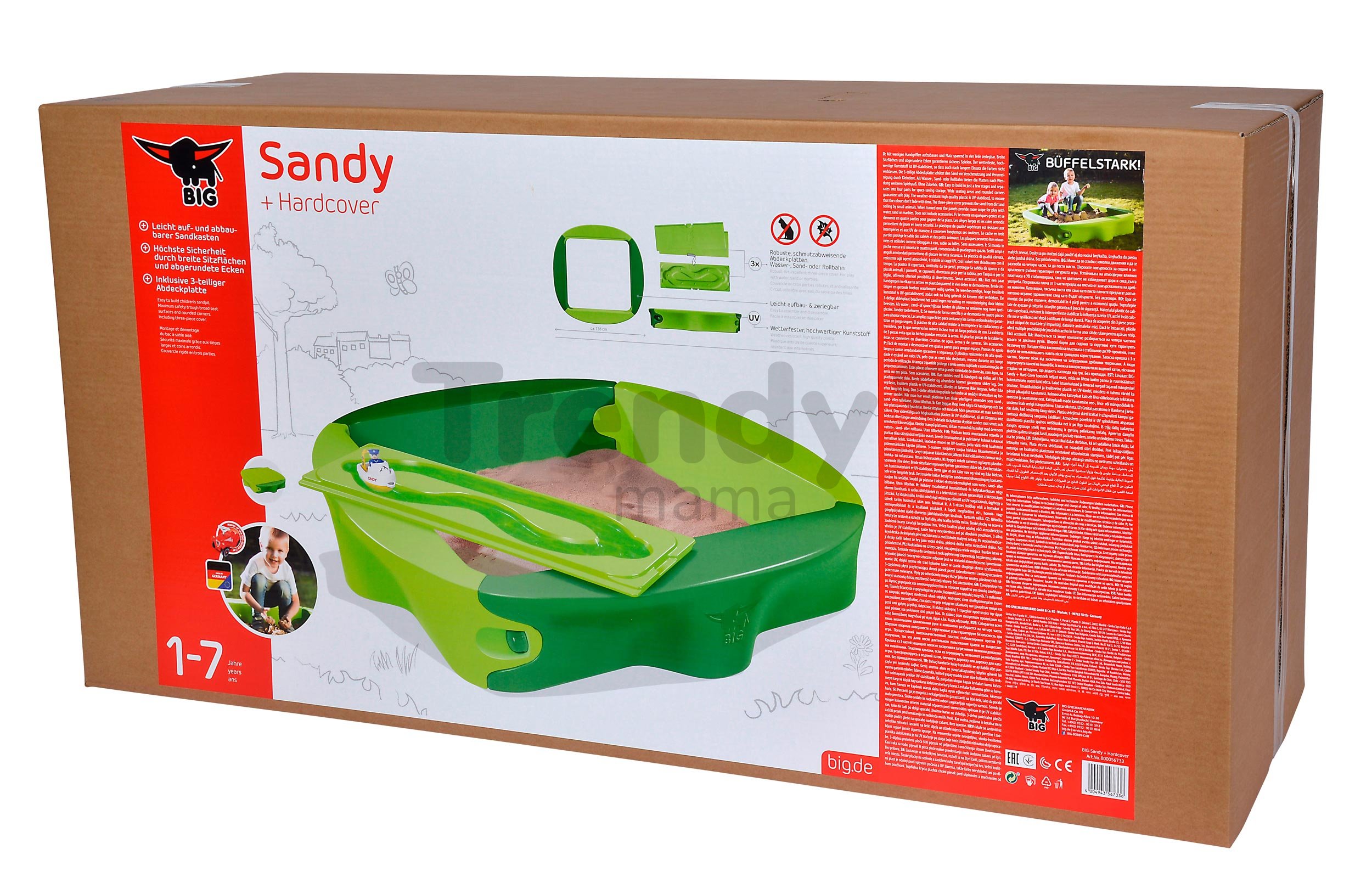 Nisiparul BIG Sandy este unul dintre cele mai renumite produse dintr-o anumită categorie. Datorită volumului nisiparului de la firma germană BIG, încape în acesta 389 kg de nisip. Nisiparul este dotat şi cu un capac, care oferă protecţie împotriva poluării. Nisiparul verde în formă tradiţională de pătrat are dimensiuni exterioare de 138*138*24 cm, iar dimensiunile interioare sunt 100*100 cm. Folosirea produsului este recomandată de la vârsta de 12 luni. Un avantaj uriaş al acestuia este practicitatea, deoarece nisiparul poate fi demontat în doar câteva secunde, poate fi mutat altundeva şi poate fi asamblat din nou foarte repede. Capacul pliabil face parte din ambalaj, al cărui suprafaţă este completată cu o pistă, astfel copii în timpul jucatului cu nisip se vor putea juca şi cu maşinuţe mici. Dacă pista este umplută cu apă, copii vor avea un canal de nave. Capacul este un accesoriu foarte important şi esenţial, deoarece apără perfect nisiparul de la excrementele animalelor şi de materiile care poluează şi care sunt suflate în acesta de către vânt.