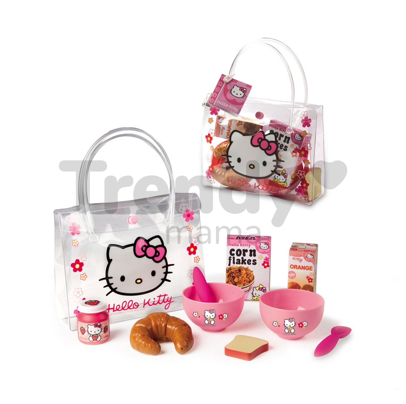 Setul de mic dejun, care se poate achiziţiona într-o geantă frumoasă transparentă, conţine 2 boluri încântătoare de culoare roz, 2 linguri roz rezistente, un croissant mic, o cutie cu gem şi o pâine prăjită mică. În geanta de mic dejun mai putem găsi o cutie cu cereale şi un fresh de portocale. Cu setul de mic dejun de copii cu un design Hello Kitty puteţi învăţa copii cum să consume un mic dejun sănătos şi regulat, care cu setul Hello Kitty va fi şi mai amuzant. Un avantaj mare al genţii de copii Hello Kitty, este că copii o pot folosi chiar şi separat, ca şi o geantă de mână pentru depozitarea altor jucării. Setul de mic dejun de copii este recomandat mai ales fetiţelor de la vârsta de 3 ani.