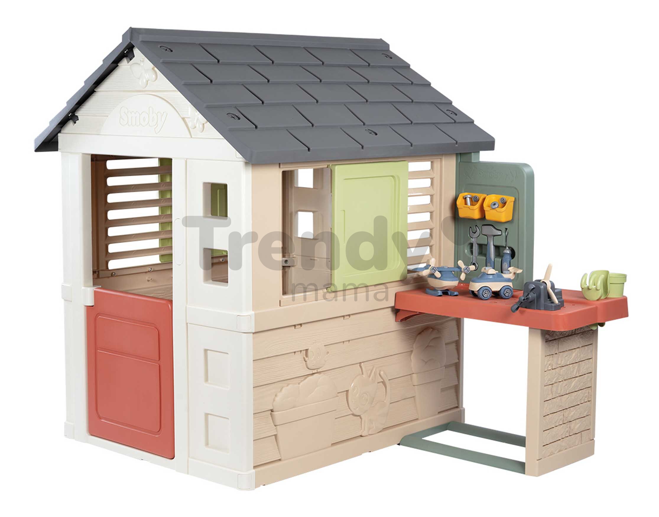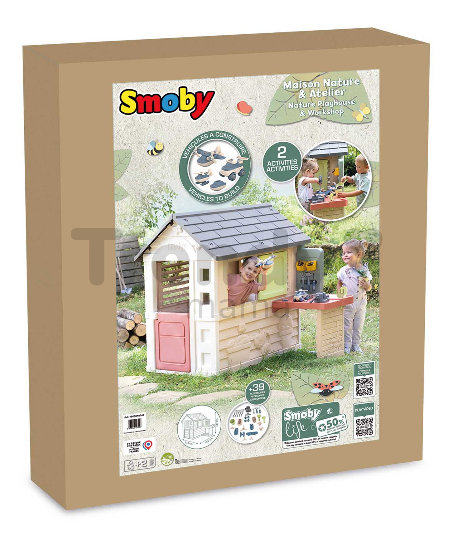 Domček s pracovnou dielňou Nature Playhouse Workshop od francúzskeho výrobcu Smoby predstavuje vynikajúci darček pre kreatívne deti už od 2 rokov. V prednej časti domčeka sa nachádzajú polovičné dvere, bočné steny sú vybavené 2 oknami s posuvnými okenicami, vďaka ktorým si deti užijú príjemný vánok aj počas letných dní. Štýlový domček v jemných prírodných farbách pôsobí moderne a nadčasovo, ozdobí každú záhradu a dvor. Súčasťou domčeka je aj pracovná dielňa s 39 doplnkami, ktorú ocenia najmä chlapci pri hre na konštruktérov a opravárov.