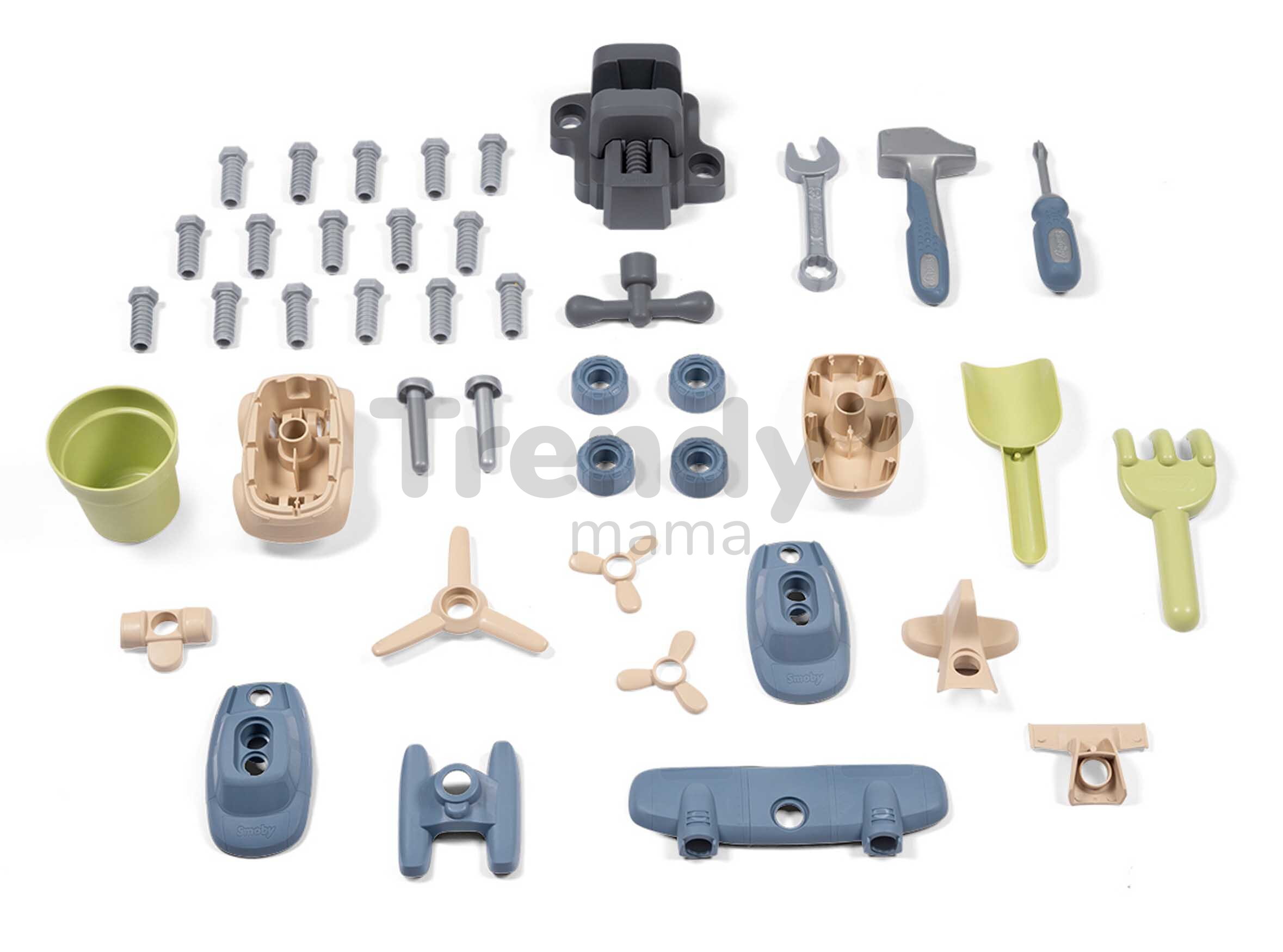 Detská pracovná dielňa je vybavená stenou na náradie s otvormi pre montážny kľúč, kladivo a skrutkovač, potešia ich aj žlté boxy na drobné súčiastky. Praktická pracovná doska je vybavená montážnymi otvormi, zverákom na prichytenie súčiastok a odkladacím priestorom pre hrabličky, lopatku a plastový kvetináč, v ktorom si môžu dievčatká vypestovať kvety. Chlapci sa zabavia pri skladaní stavebnice, vyskúšajú si svoju šikovnosť pri skladaní lietadla, autíčka, malej helikoptéry alebo člna. Kreatívny kútik prinesie deťom ešte krajšie zážitky a pomáha im naplno rozvíjať logické myslenie, predstavivosť a jemnú motoriku.
