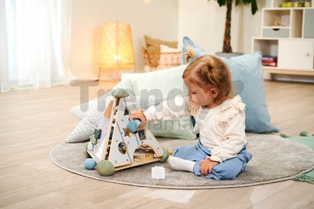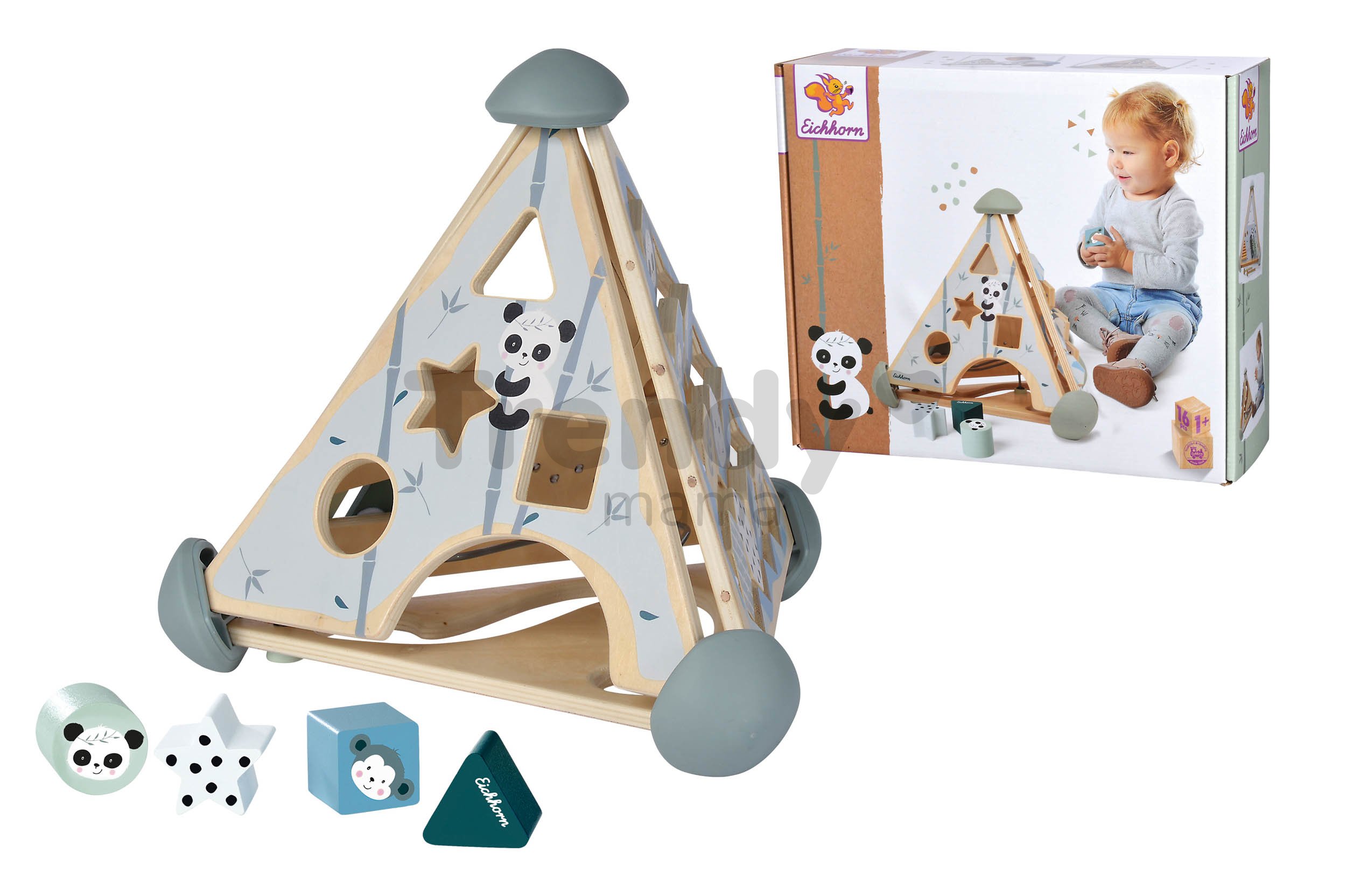 Drevená didaktická pyramída Game Center od nemeckej značky Eichhorn je perfektná didaktická hračka pre všetky deti od 12 mesiacov. Drevená pyramída je vyrobená z kvalitné brezového dreva a vďaka originálnemu dizajnu s motívom pandy vytvorí v izbičke útulnú a kreatívnu atmosféru. Chlapci aj dievčatá si vyskúšajú svoju šikovnosť pri rôznych didaktických hrách, ktoré ponúka každá stena pyramídy. Tešiť sa môžu na vkladacie kocky, ktoré sa naučia vkladať do správnych otvorov, hudobný xylofón s paličkami, pexeso a skvelú dráhu pre 2 loptičky. Pyramída sa pýši pevnou a odolnou konštrukciou, jej rohy sú chránené mäkkým silikónom, takže sa deti hrajú v úplnom bezpečí.