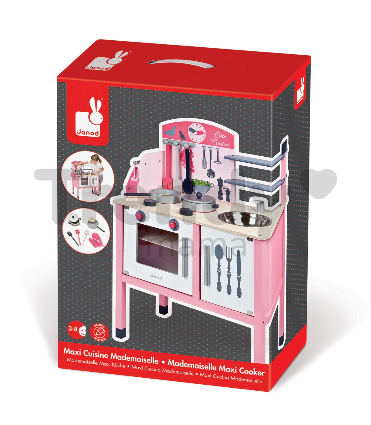 Janod drevená kuchynka Mademoiselle Maxi Cooker je detailne prepracovaná drevená hračka vhodná pre dievčatká od 3 do 8 rokov. Detská kuchynka má rozmery 58*30*78 cm, jej celková výška je 78 cm. Kuchynka pre deti je ladená v dievčenskej ružovej farbe, v balení 8 nevyhnutných kuchynských doplnkov pre malé kuchárky. Ide o doplnky: panvica s pokrievkou, hrniec, 3 magnetické drevené varešky, chňapka a umelohmotné vajíčko na imitáciu volského oka. Vstavanou súčasťou detskej kuchynky je sporák so zapaľovaním, rúra, poličky, umývadlo a hodiny. Tejto krásnej hračke určite neodolá žiadna malá milovníčka jedla a varenia. Deti si môžu vymýšľať vlastné recepty, zahrať sa na šéfkuchárov alebo jednoducho navariť niečo dobré pre svoju milovanú rodinku a rozvíjať tak svoju fantáziu a kreativitu. Drevená kuchynka pre deti je nadčasová hračka, ktorá nikdy neomrzí, je vyrobená z kvalitného dreva a zdravotne neškodných a odolných farieb.