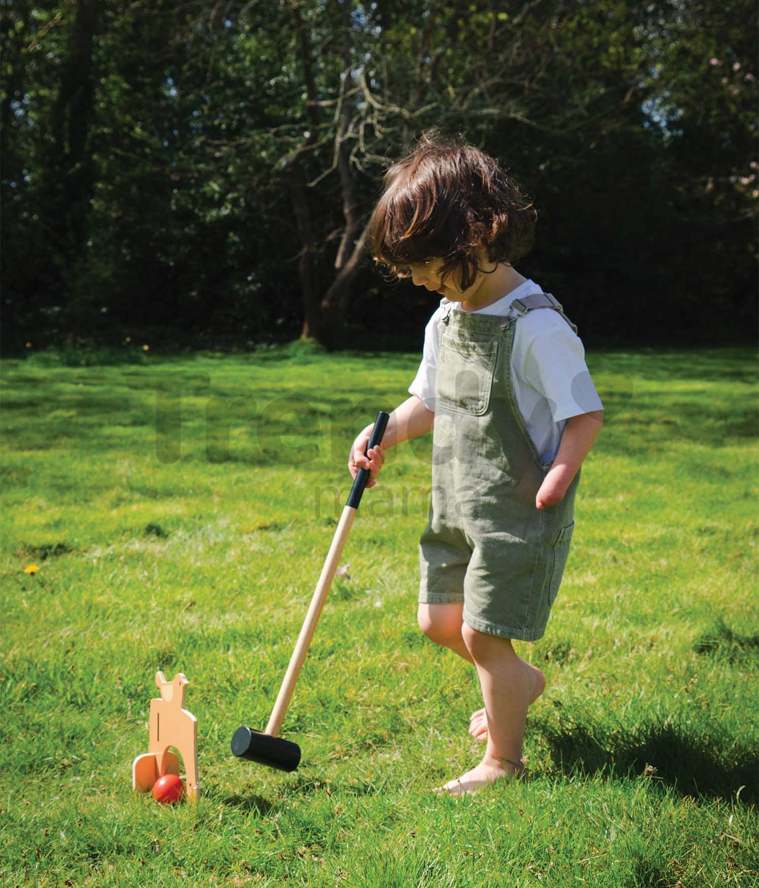 Nádherné sýte farby a pravý britský dizajn na drevenej súprave podnecuje rozvoj fantázie a kreativity, prebúdzajú zdravú detskú súťaživosť. Dieťa bude môcť súťažiť s kamarátmi a súrodencami, vyskúšajú, kto má najpresnejšiu mušku pri triafaní drevených lôpt do bránok. Hra Kroket precvičuje u detí odhad vzdialeností, koordináciu pohybov a presnosť. Môžu sa hrať sólo, v tímoch, na body, alebo len tak bez pravidiel - pre radosť z hry. Bránky sú dobre vyvážené, pre hru je potrebná rovná pevná plocha.