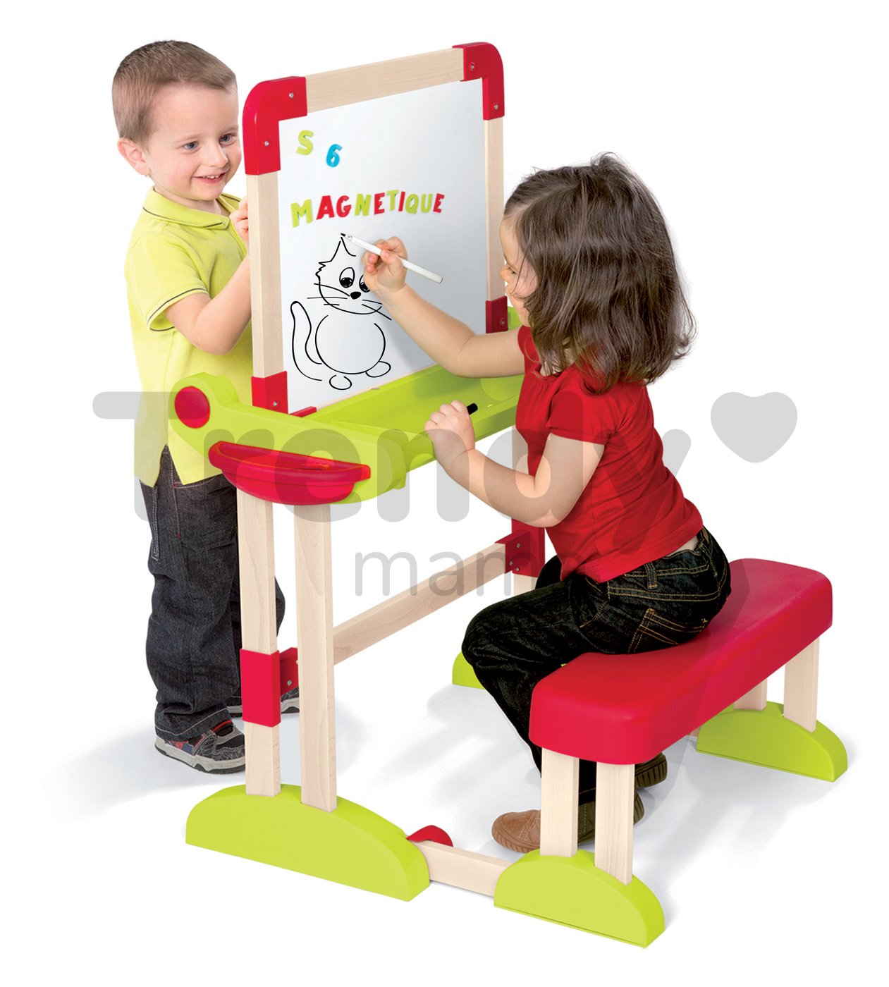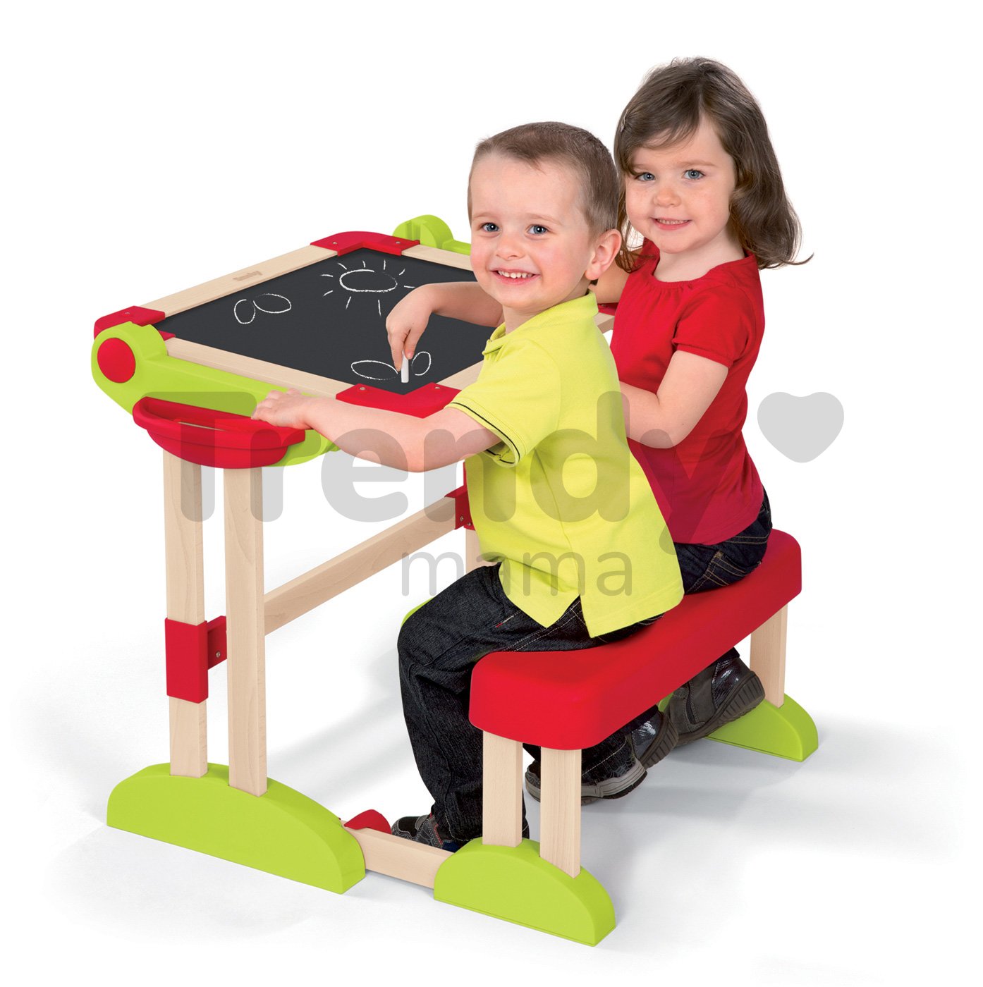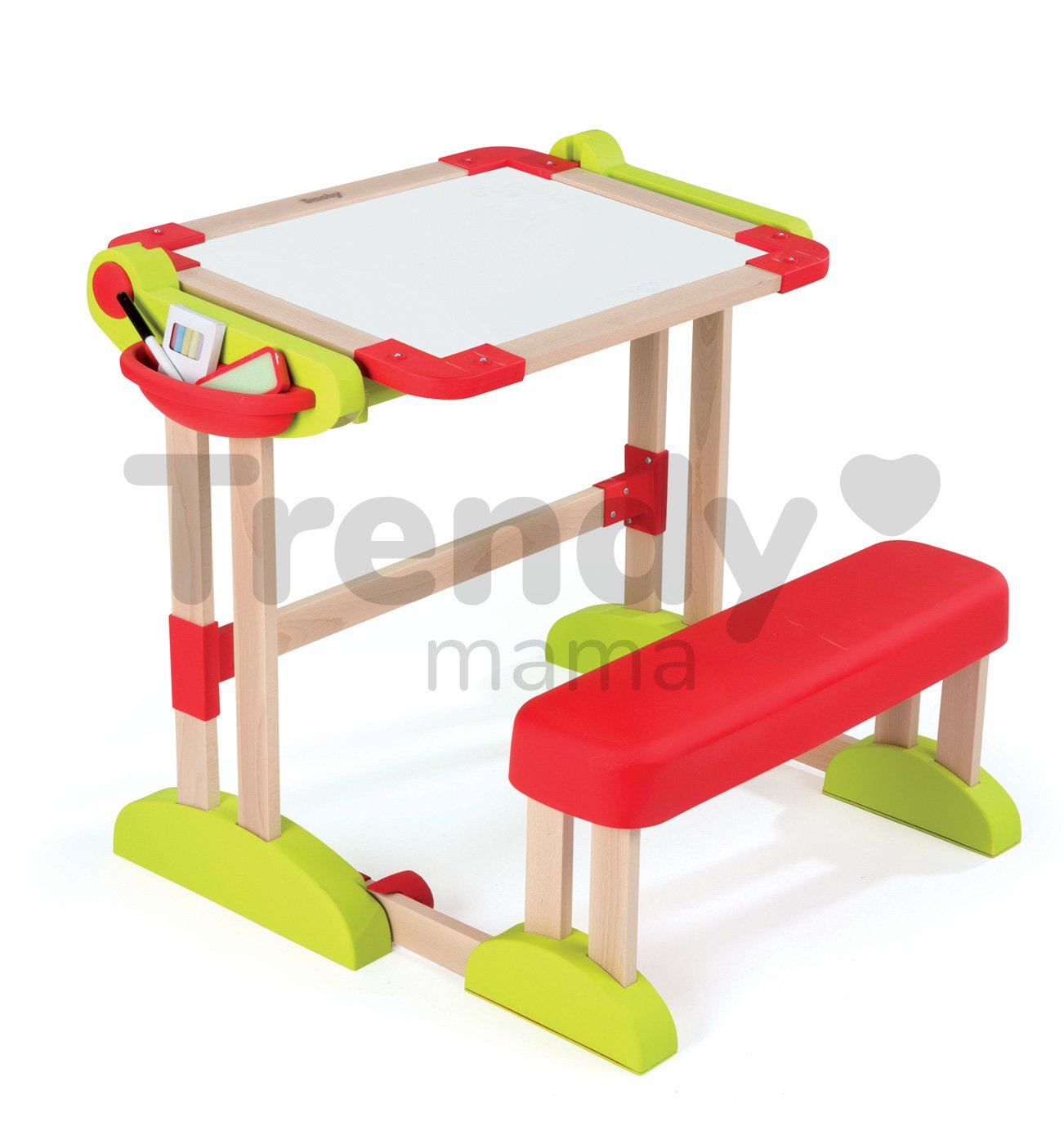 Hľadáte pre dieťatko stolík na kreslenie? Smoby Vám ponúka drevenú obojstrannú školskú lavicu Modulo Space, na ktorú dieťa môže písať fixkou a kresliť kriedou.