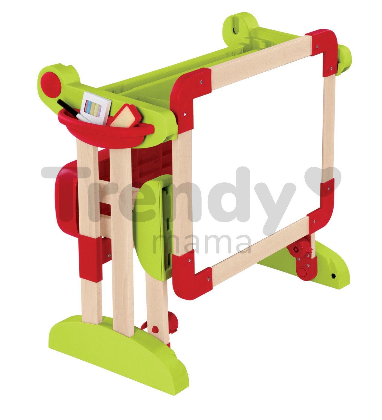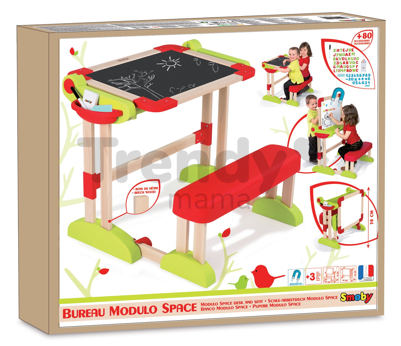 Are o culoare frumoasă luminoasă de lemn natural, în combinație cu culoarea roșie strălucitoare și culoarea verde, precum și un mic recipient roșu pe o parte, unde puteți stoca stilourile și accesoriile pentru scris. Banca școlară este potrivită copiilor de la 3 ani. Dimensiunea băncii pentru copii este de 64 * 60 * 58 cm. Banca școalară este un ajutor imens pentru micii școlari sau preșcolari, care pot să-și repete lecțiile sau pot desena. Bancheta conține până la 60 de accseorii, inclusiv litere magnetice clasice, cifre de la 0 la 9, diferite caractere + - = / x, carioci, cretă colorată, și burete de șters. Poate fi dezasamblată în 5 secunde fără utilizarea instrumentelor de lucru. Se potrivește foarte bine în camera copiilor.