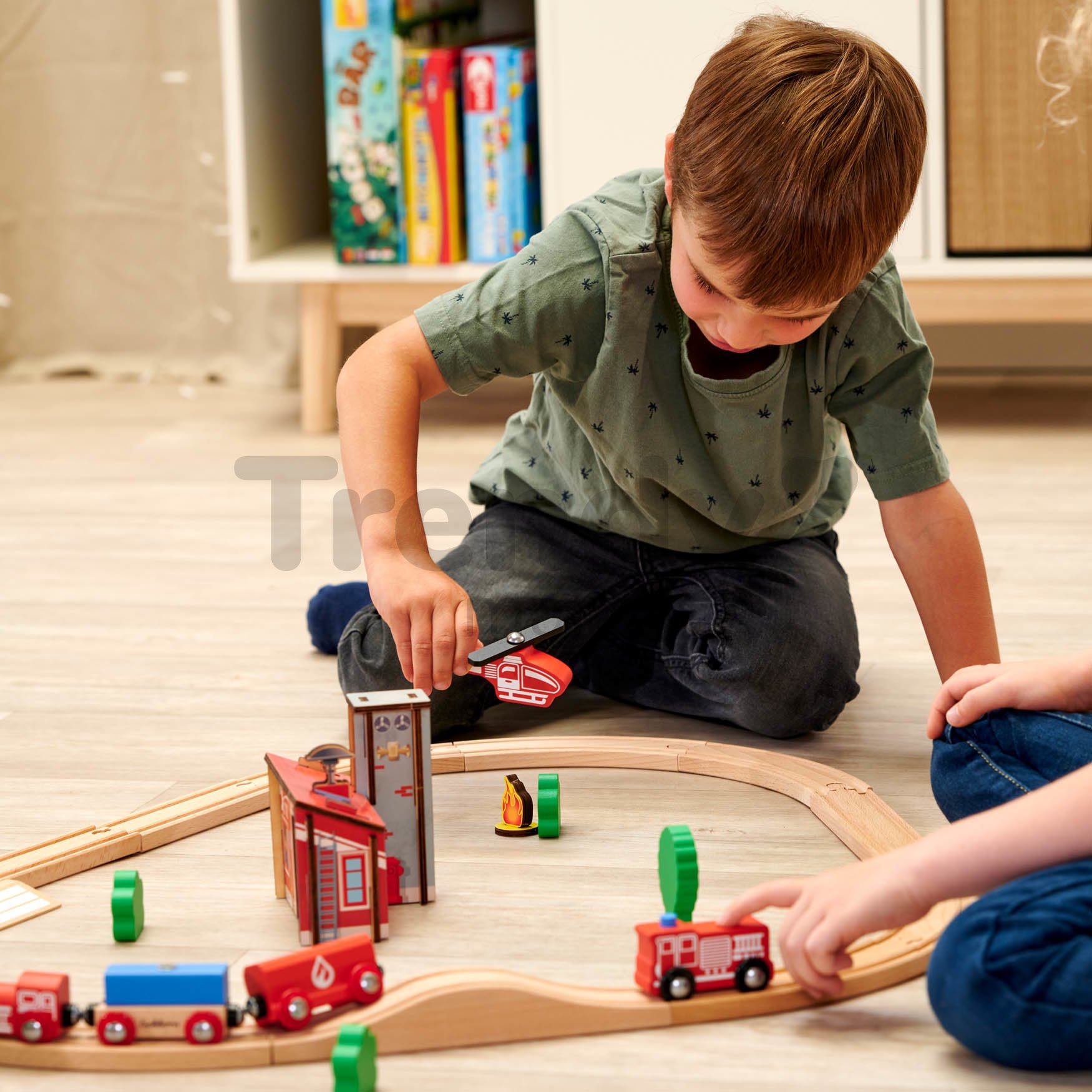 Drevená vláčikodráha Train Set Firestation od nemeckej značky Eichhorn predstavuje skvelý darček pre všetky deti už od 3 rokov. Nadčasová drevená stavebnica je vyrobená z prvotriedneho bukového dreva, ktoré deťom prinesie neopakovateľný zážitok pri hre s klasickým prírodným materiálom. Bohatá 33-dielna sada obsahuje drevené koľajnice, ktoré vytvoria trať s dĺžkou až 235 cm, lokomotívu s 2 vozňami, požiarnu stanicu, helikoptéru, požiarne autíčko, figúrku požiarnika aj stromčeky a kríčky. Pestré a sýte farby na doplnkoch ozdobia každú detskú izbičku, deti objavujú svoje schopnosti a zručnosti pri skladaní stanice a spájaní drevených koľajníc.