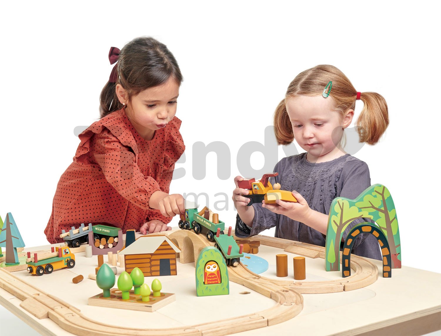 Drevená vláčikodráha v borovicovom lese prinesie každému dieťaťu od 3 rokov hodiny plné kreatívnej zábavy a originálnych zážitkov. Nadčasovú stavebnicu navrhli dizajnéri Tender Leaf Toys priamo vo Veľkej Británii, vyznačuje sa pravým britským dizajnom, ktorý očarí chlapcov aj dievčatá. Bohatá sada doplnkov obsahuje lokomotívu s 3 vozňami, na ktorých budú prevážať rôznofarebné polienka. Tie sa dajú uložiť na špeciálnu podperu a strážiť ich bude figúrka spiaceho medvedíka. Nakladač s magnetickým ramenom sa postará o náklad guľatiny s magnetom a bez problémov ju vyloží na kamión s prepravnou plošinou.