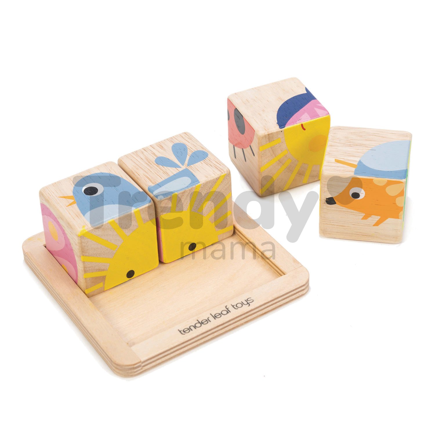 Drevené rozprávkové kocky Baby Blocks je vynikajúca voľba pre všetky deti od 18 mesiacov, na ktorej vývoji sa podieľali špičkoví dizajnéri značky Tender Leaf Toys priamo vo Veľkej Británii. Sadu 4 kociek si deti budú môcť poskladať viacerými spôsobmi tak, aby dostali vždy jeden krásne maľovaný obrázok. Kocky si dieťa môže skladať na kvalitnej drevenej podložke, pričom sa nielenže výborne zabaví, ale takisto si rozvíja všetky zmysly, spoznáva nové veci a tvary dotykom, rozoznáva jednotlivé farby a správne pospája jednotlivé obrazce. Touto hrou si zlepšuje priestorové videnie aj jemnú motoriku prirodzenou hravou formou.
