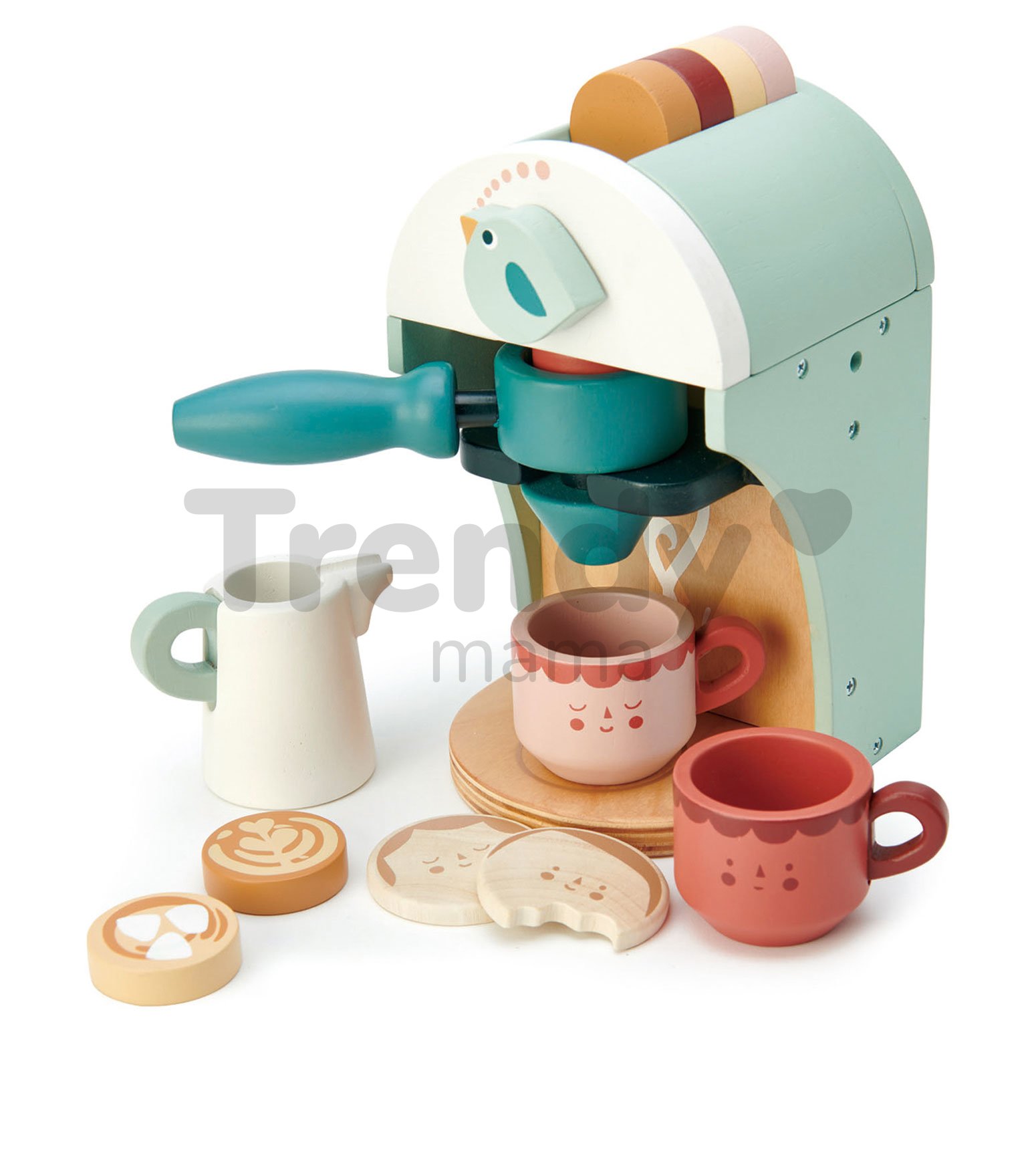 Drevený kávovar Cappuccino Babyccino Maker predstavuje skvelý darček pre všetkých chlapcov a dievčatá od 3 rokov, ktoré sa môžu zahrať na profesiu baristov. V sade sa okrem kávovaru nachádzajú 2 šálky s usmiatymi tváričkami, kanvica na mlieko, 2 kávové náplne, 5 farebných kávových kapsulí a 2 keksíky s tváričkami. Vo vrchnej časti kávovaru je úložné miesto pre kávové kapsule, ktoré sa dajú jednoducho vybrať a umiestniť do zadnej časti pohyblivej rukoväte, ktorá vloží do kávovaru. Potom už dieťa pomocou otočného gombíka v tvare vtáčika spustí prípravu kávy, ktorú ponúkne sebe a svojim kamarátom. Nadčasový kávovar s doplnkami navrhli poprední dizajnéri Tender Leaf Toys priamo vo Veľkej Británii a na výrobe sa podieľali zruční remeselníci, je to výborný doplnok k dreveným detským kuchynkám.