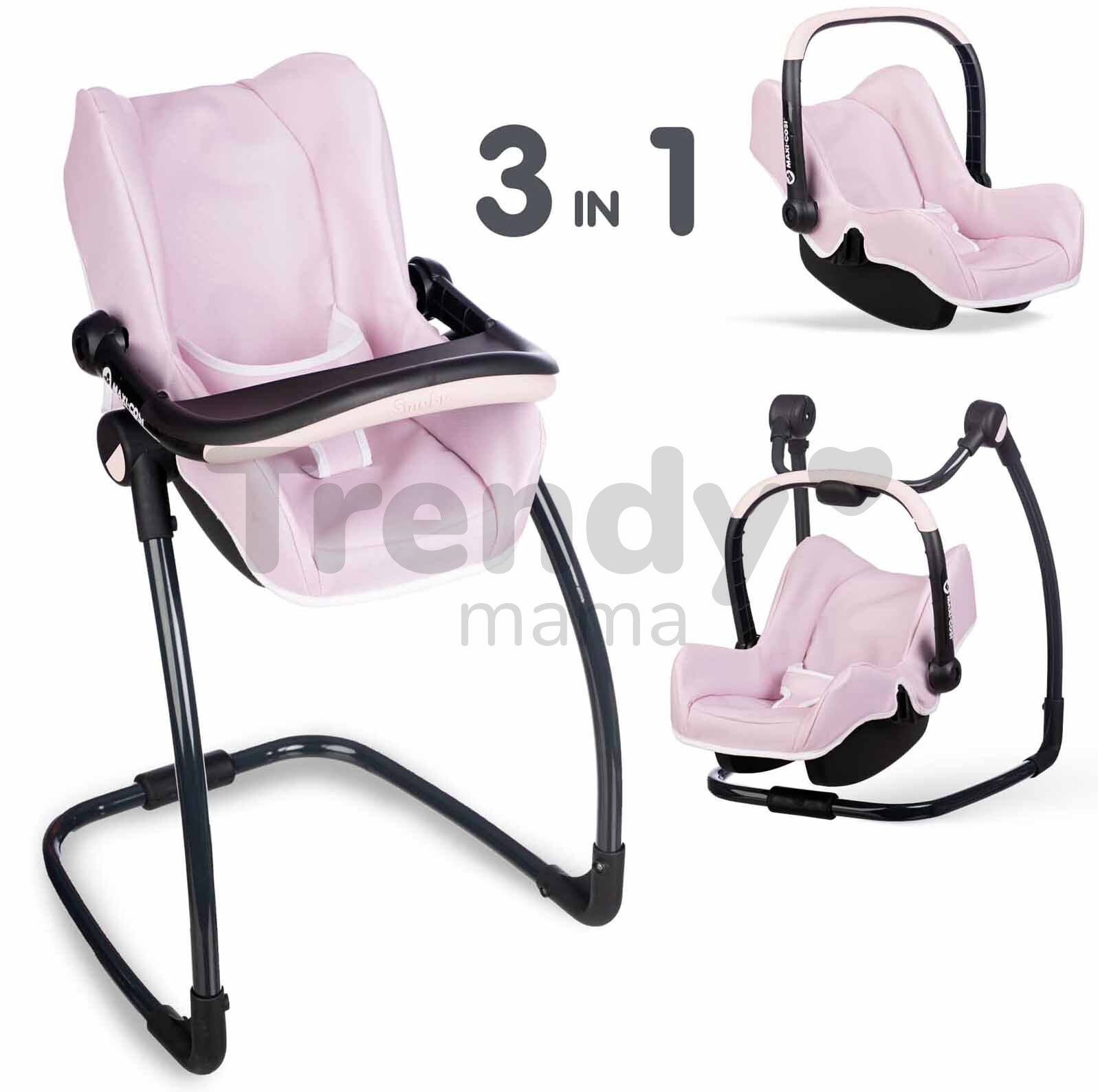 Jedálenská stolička s autosedačkou a hojdačkou Highchair Pink z modernej edície Maxi Cosi&Quinny od francúzskej značky Smoby je originálna 3-kombinácia hračiek, ktorá poteší dievčatká už od 3 rokov. Pri starostlivosti o svoju obľúbenú bábiku využijú jedálenskú stoličku s výškou 71 cm na kŕmenie bábiky, potom stoličku jednoducho upravia na pohodlnú hojdačku, v ktorej môžu bábiku po chutnom obede hojdať a uspávať. Pri cestovaní sa môžu spoľahnúť aj na autosedačku s ergonomickou rukoväťou, takže sa s bábikou odvezú aj v aute, pričom je chránená aj bezpečnostným pásom proti vypadnutiu. Multifunkčný doplnok je určený pre bábiky s maximálnou výškou 42 cm.