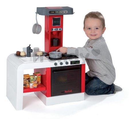 Această bucătărie de jucărie conţine şi o chiuvetă care poate fi îndepărtată. Sub chiuvetă se află un raft pentru vase sau pentru alimente. Bucătăria de jucărie este dotată şi cu un cuptor electric cu două ochiuri, care emite sunete de prăjit şi gătit. Blatul de lucru include şi o scurgătoare de vase. Aragazul este completat şi cu un ceas digital, iar cuptorul luminează şi arată temperatura de coacere. Deasupra plitei găsim o hotă modernă, cu cârlige mici pe care sunt agăţate tacâmurile. Bucătăria este echipată şi cu un aparat de cafea încorporat, care emite sunete reale și include încă un cuptor cu propriile sale grătare de grill. Prin uşa transparentă a cuptorului, copiii vor putea urmări coacerea alimentelor aşezate pe gratiile acestuia. Cănd pornim cuptorul se aprinde lumina interioară, iar în momentul în care măncarea este finalizată, suntem atenţionaţi de către un sunet, se stinge lumina din cuptor şi mâncarea este gata pentru a fi servită. Această bucătărie Smoby conţine în total 21 de accesorii. Aceste accesoriile includ vase, tacâmuri, oale și o varietate de alimente. Înălţimea blatului de lucru, al bucătăriei de jucărie, este 31 cm. Dimensiuniea bucătăriei de jucărie este 47*29*62 cm.