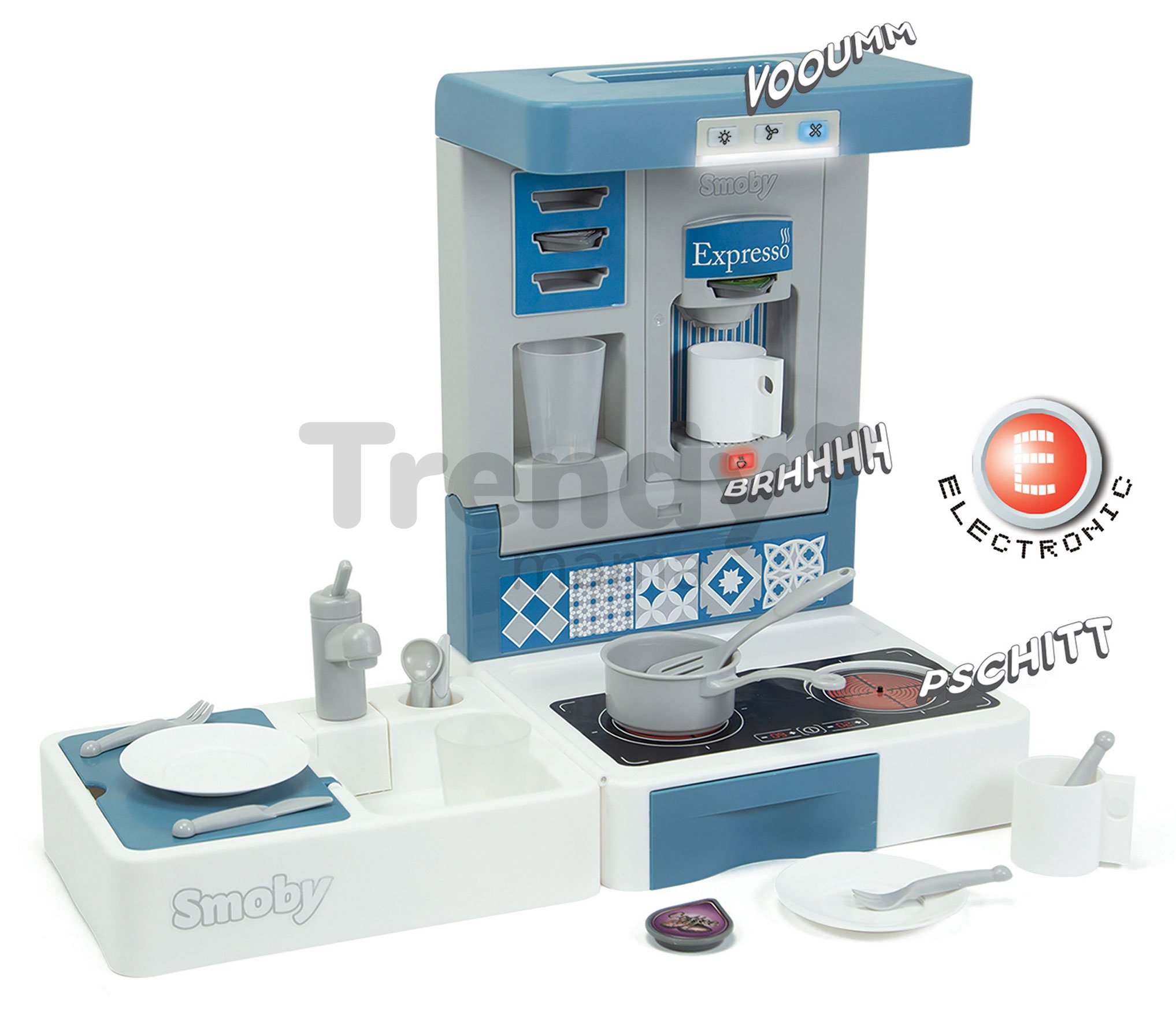 Vynikajúca varná doska vydáva realistický zvuk varenia, ktorý prekvapí každé dieťa. Na kávovare sa po stisnutí tlačidla zjaví svetielko upozorňujúce na ohrievanie vody a takisto vydáva zvuk, ako pri skutočnom kávovare. Praktický digestor v sebe skrýva funkciu osvetlenia a malí kuchári pri varení môžu zapnúť 2-stupňovú ventiláciu so zvukom simulujúcim funkciu výparníka. Súčasťou kuchynky je aj drez na umývanie riadu s odkladacím priestorom, sódovač, kávovar s rôznymi kapsulami, zásobník na kapsule a zásuvka na doplnky a príslušenstvo. V hornej časti kuchynky sa nachádza aj digestor s 3 gombíkmi pre nastavenie osvetlenia a intenzity odsávania. Bohatá výbava 17 doplnkov v sebe skrýva hrniec, lopatku, 2 poháre, 2 šálky, 2 tanieriky, 2 lyžičky, 2 vidličky, 2 nožíky a 3 kapsule.