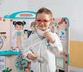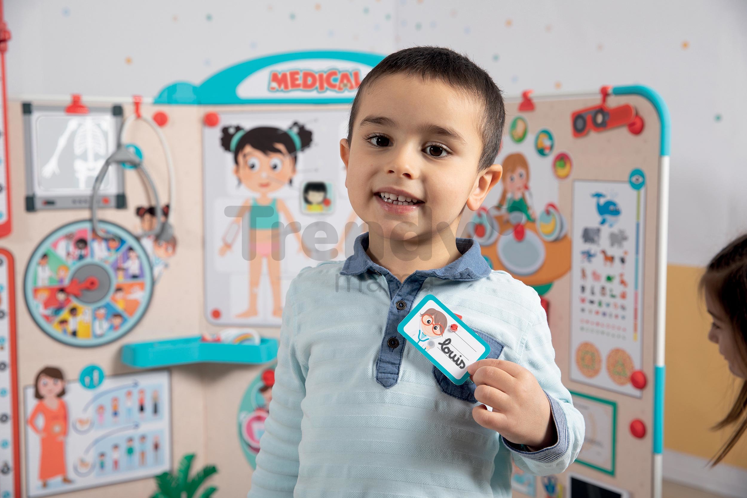 Taktiež sa naučia rozpoznávať jednotlivé časti tela a pripájať na ne zdravotné pomôcky so suchým zipsom a v časti so zdravou výživou sa dozvedia, čo ich pacienti jedli počas dňa. Zahrajú sa aj na očných lekárov a otestujú zrak pacienta pomocou obrázkov rôznofarebných zvieratiek a špeciálnymi okuliarmi. Odmerajú výšku pacienta s posuvným meradlom (max. výška 1,20 m), zistia, koľko váži a dokonca sa naučia sa určovať pohlavie dieťaťa pomocou vývojovej tabuľky. K dispozícii budú mať aj koliesko s plánovačom vyšetrovacích úkonov a praktické boxy na odloženie lekárskych nástrojov. Vnútorná časť ordinácie je ozdobená krásnymi obrázkami s motívom lekárskej ambulancie, vonkajšiu stranu zdobí motív s veselými rodičmi a deťmi pred ordináciou.