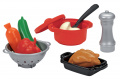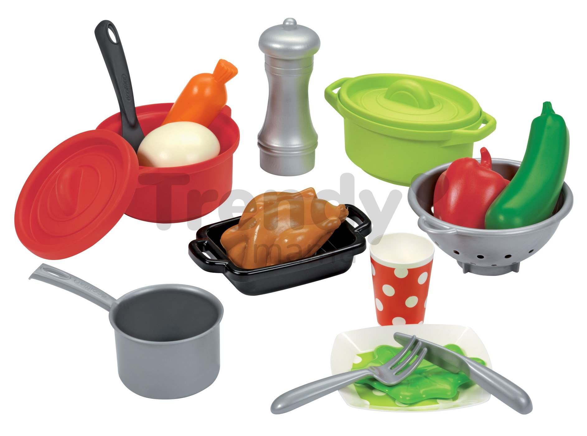 Setul conține încă 3 vase cu capac de, diferite mărimi și culori, un bol roșu cu un țel verde, o tavă neagră, un tacâm negru pentru întoarcerea alimentelor, o sită de strecurat pentru paste și nu în ultimul rând, un bol mare pentru salată. Setul de vase mai conţine alimente din plastic, care sunt precum cele reale. Aici veţi putea găsi un pui la grătar, un castravete sănătos, ardei, roșie și salată verde. Datorită acestui set de vase, copilul dvs. va învăţa mai simplu să pregătească masa în mod corect, iar prin folosirea corectă a vaselor de bucătărie copii vor putea face diferenţa între alimentele de bază. Setul de vase cu accesorii pentru copii este recomandat în special fetiţelor de la vârsta de 18 luni.