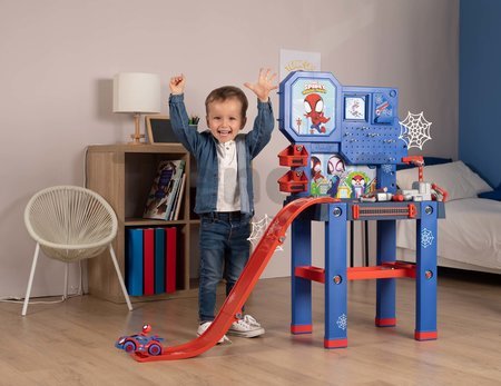 Pracovná dielňa Spidey Bricolo Center Marvel od francúzskeho výrobcu Smoby predstavuje skvelú voľbu pre všetky deti a najmä chlapcov od 3 rokov. Moderná dielňa v červeno-čiernom vyhotovení s animovaným motívom Spidey umožní deťom zahrať sa na opravárov a konštruktérov. Originálna súprava 92 doplnkov v sebe skrýva pracovné náradie - pílku, montážne kľúče, kliešte, kladivo, skrutkovač, skrutky, klince, matice, zverák, boxy a montážne dieliky. Deti sa môžu tešiť aj na skladacie autíčko s figúrkou Spidey, ktoré môžu spúšťať po rampe z pracovného stolíka.