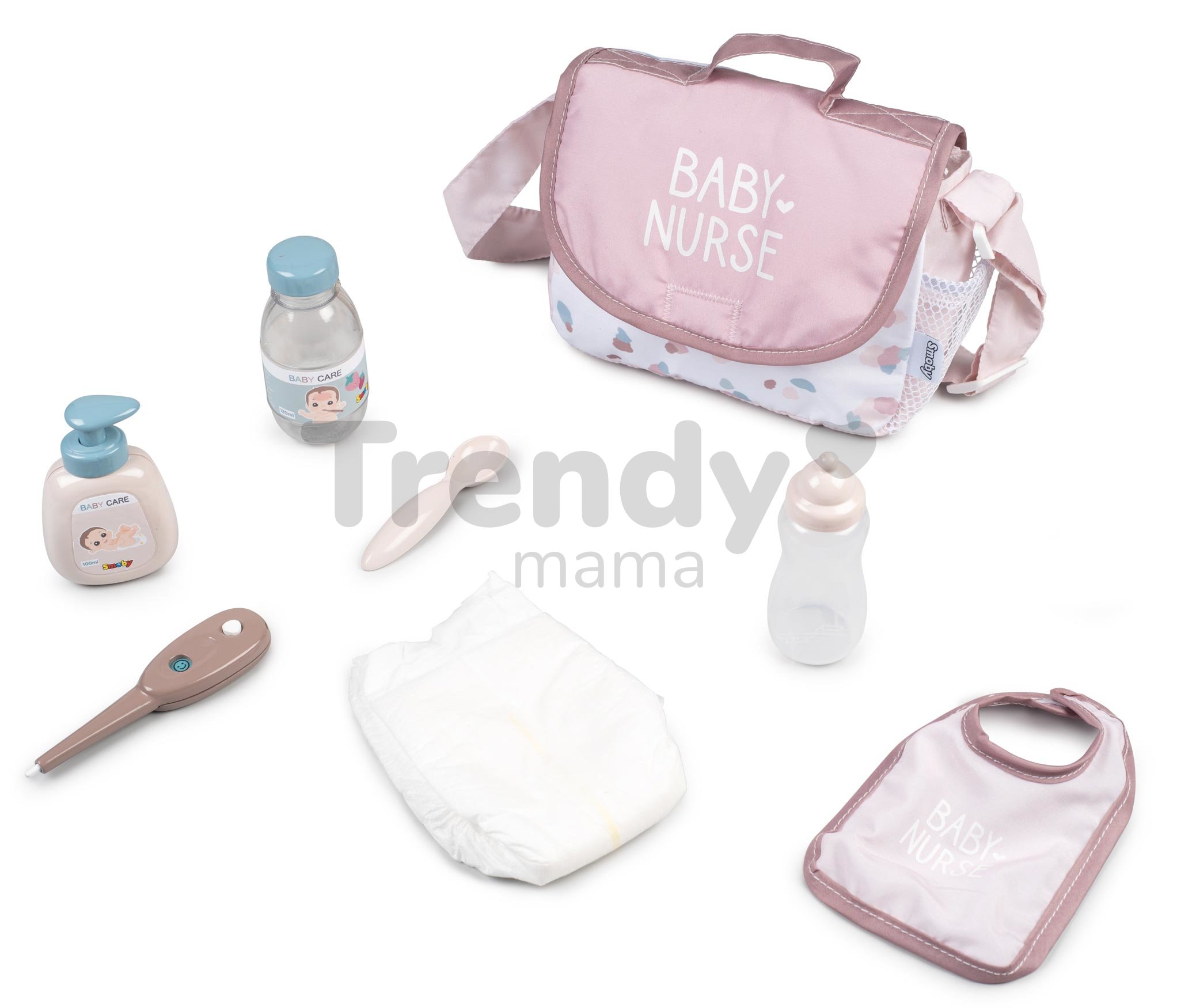 Prebaľovacia taška s plienkou Changing Bag z populárnej kolekcie Baby Nurse predstavuje skvelý darček pre všetky deti od 3 rokov, ktoré sa rady hrajú s bábikami. Taška sa dá pri starostlivosti o bábiku jednoducho rozložiť a deti ju pri prebaľovaní položia na podložku. Taška pre bábiku je vyhotovená v jemných pastelových farbách ružovej a bielej, takže očarí každé dievčatko. Je vybavená popruhom s nastaviteľnou dĺžkou a úložným priestorom, takže si dievčatká môžu vziať celú výbavu kamkoľvek so sebou. V 8-dielnej súprave doplnkov sa nachádza okrem tašky aj fľaška na kŕmenie, lyžička, teplomer, plienka, fľaštička, podbradník a sirup.
