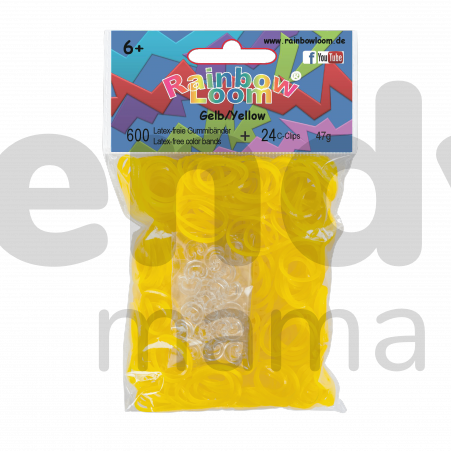 Rainbow Loom žlté nepriesvitné gumičky na vytvorenie tých najkrajších silikónových náramkov sú určené pre deti od 6 rokov, ale vedia s nimi pracovať aj 5 ročné deti. Detské gumičky sú bezolovnaté, bez ftalátov a BPA, vďaka čomu sú pevné, kvalitné a bezpečné pre deti. Balíček obsahuje 600 kusov gumičiek žltej farby a 24 kusov malých plastových svoriek "céčiek", pomocou ktorých sa náramok spája a drží.