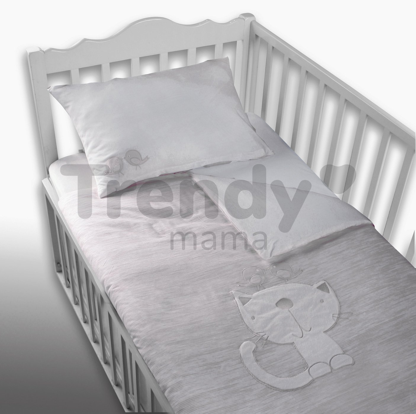 Plapuma pentru pătuț ține cald copilului în timpul somnului. Materialul este respirabil, ținând cont de nevoile celor mici la fabricare. Pe fundalul gri al lenjeriei pentru plapumă sunt motive drăguțe cu pisică și pasăre. Partea cealaltă a lenjeriei de pat este de culoarea albă, completând perfect pernuța. Colțurile cearșafului pentru pernă sunt decorate tot cu motive de pasăre, păzind somnul bebelușilor și nu deranjând. Copii și părinții se vor indrăgosti din prima clipă de această păturică gri cu pernă, decorate cu motive drăguțe cu pisicuță.