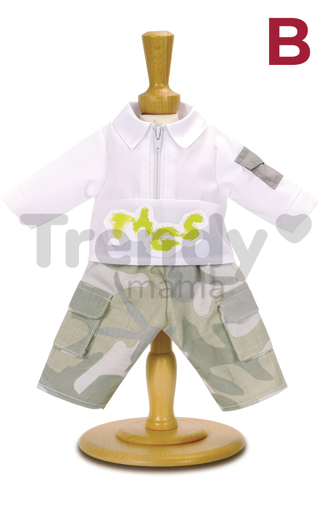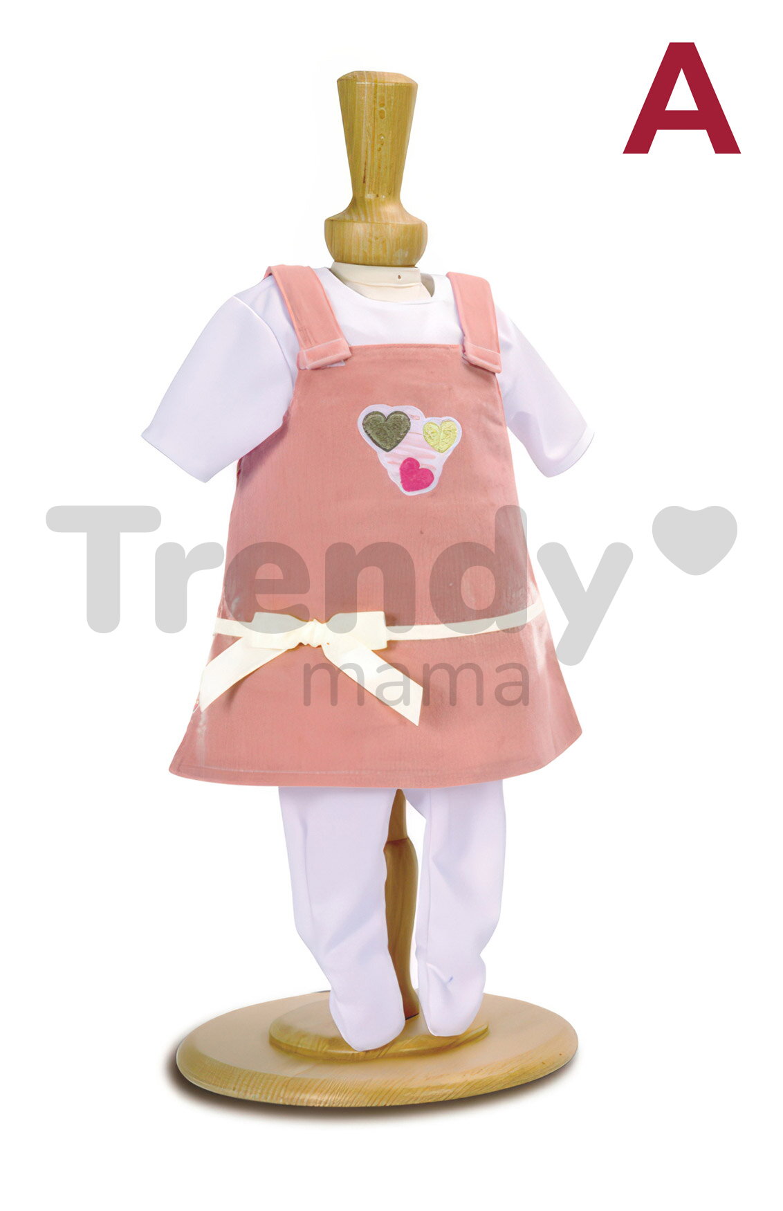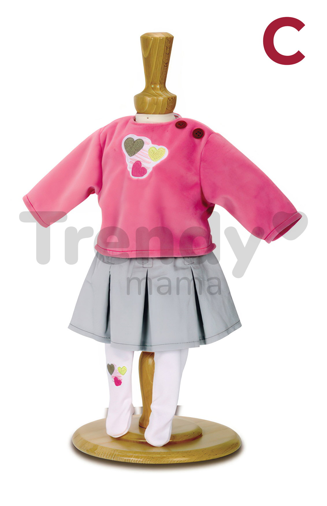 Setul este compus din: A: rochie roz cu inimioare, cu bluză albă şi cu şalopetă, B: haine de băieţi pentru păpuşă - pantaloni în stil militar, bluză albă cu fermoar şi cu etichetă TAGS, C: pulover roz şi fustă gri cu şalopetă.