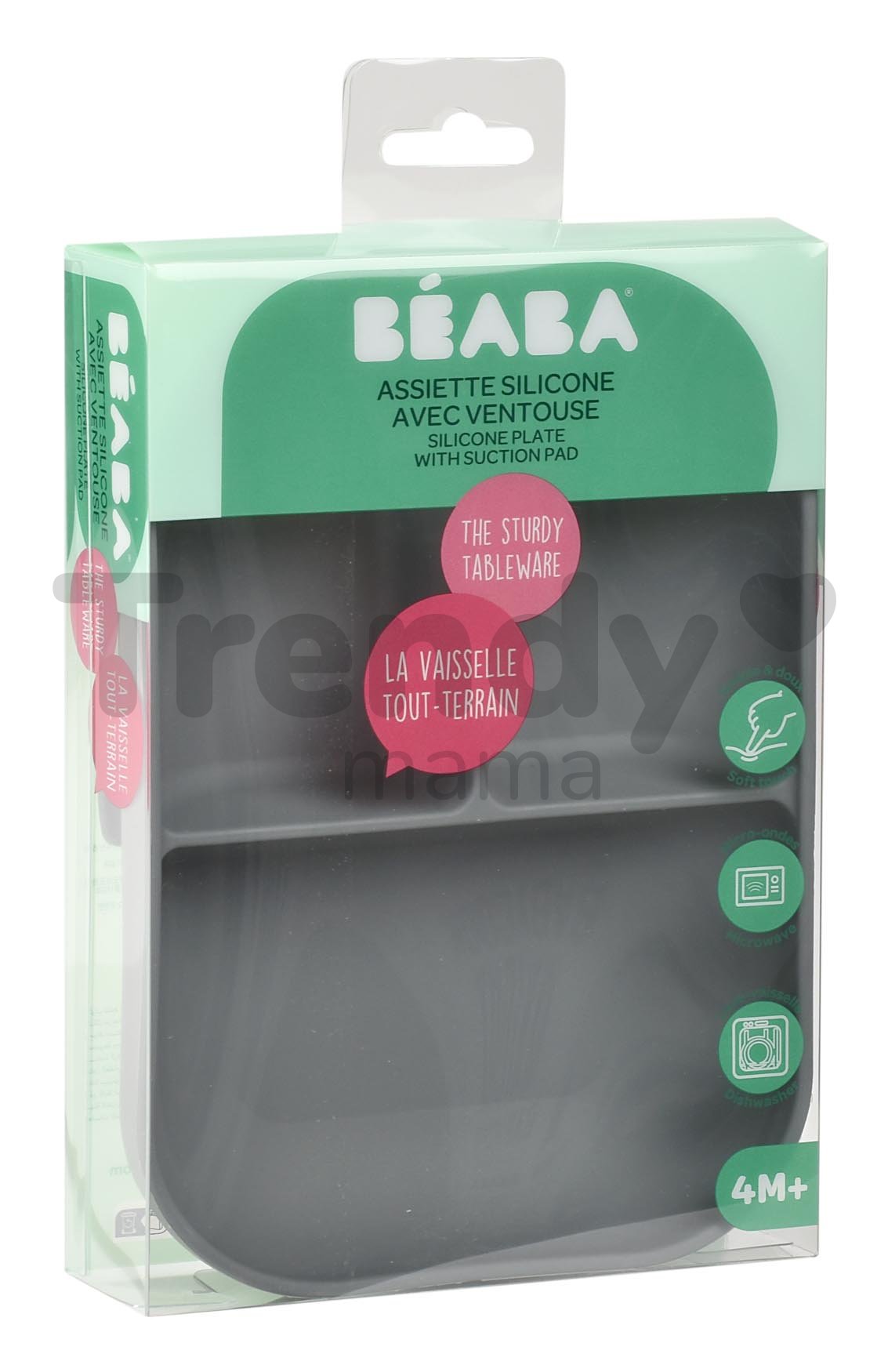 Silikónový tanier s prísavkou Silicone Suction Plate Beaba sa stane vernou súčasťou každej domácnosti s deťmi od 4 mesiacov. Tento tanier v tmavosivej farbe dokonale ladí s ostatnými pomôckami na jedenie Beaba a uľahčí kŕmenie nielen rodičom, ale aj deťom. Tanier z kvalitného hrubého silikónu je prispôsobený potrebám najmenších detí, preto mu nechýba ani praktická prísavka, ktorá zabráni pohybu taniera po stole. Nemusíte sa tak báť, že dieťatko na seba vyleje horúce jedlo alebo sa celé zašpiní. Obrovskou výhodou je určite rozdelenie taniera na tri časti, vďaka čomu počas kŕmenia udržíte na tanieri poriadok. O bezpečnosť pri jedle sa postarajú aj vyvýšené oblé okraje taniera. Tanier Silicone Suction Plate Beaba môžete umývať aj v umývačke riadu.