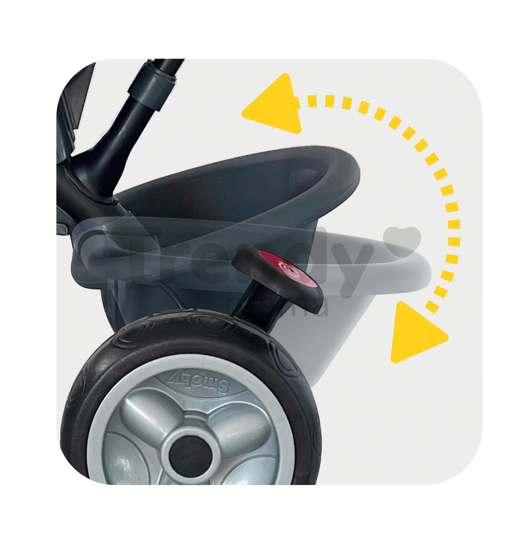 Ergonomické sedadlo sa dá nastaviť v 2 polohách, pričom je k nemu pripojená aj vysoká opierka na hlavu a chrbátik. V prípade únavy si deti môžu vyložiť nôžky na sklápacie stúpadlá. Malí šoféri ocenia protišmykové pedále a o skvelé jazdné vlastnosti sa starajú tiché EVA kolieska, ktoré sú vyrobené zo špeciálneho materiálu, kombinujúceho výhody klasických tichých gumených koliesok a odolného plastu. Riadidlá trojkolky majú 30-stupňovú vôľu vychýlenia do strán. Trojkolka má detskú poistku na riadidlách, vďaka ktorej rodič ovláda smer jazdy. O pohodlie rodičov pri manévrovaní detskej trojkolky sa postará nastaviteľná rodičovská rúčka, ktorá má maximálnu výšku 101 cm a vďaka nej sa dá trojkolka intuitívne ovládať.
