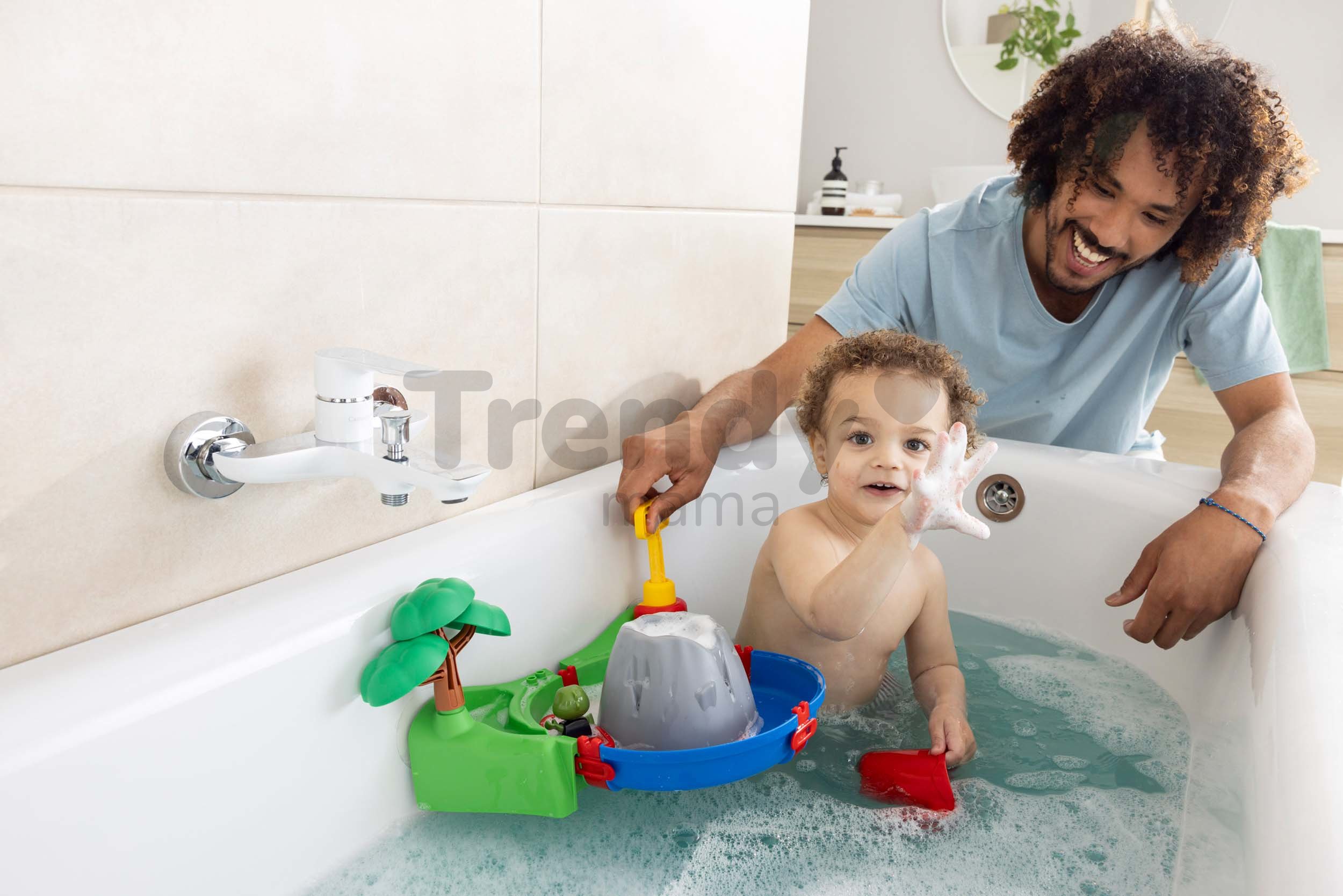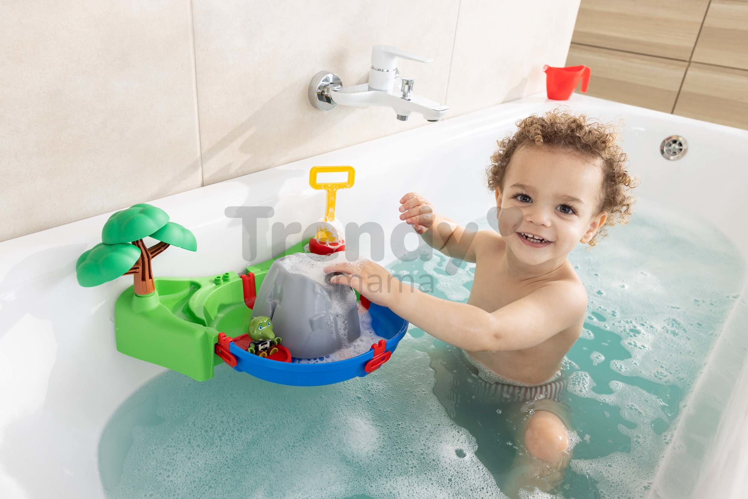 Vodná dráha do vane Sopka Volcano Sploshy AquaPlay predstavuje perfektnú voľbu pre najmenšie deti od 18 mesiacov, ktoré sa rady hrajú počas kúpania. Moderná vodná dráha je vybavená funkčnou sopkou, ktorá sa dá naplniť penou do kúpeľa a pomocou vzduchovej pumpy dieťa načerpá vodu z vane a vytvorí originálnu penovú lávu. Súčasťou vodnej dráhy je aj malé jazierko pod stromčekom, ktoré sa dá naplniť vodou pomocou krhličky a odtiaľ voda steká do vodného kanála, v ktorom pláva figúrka krokodíla Svena v červenom člne.
