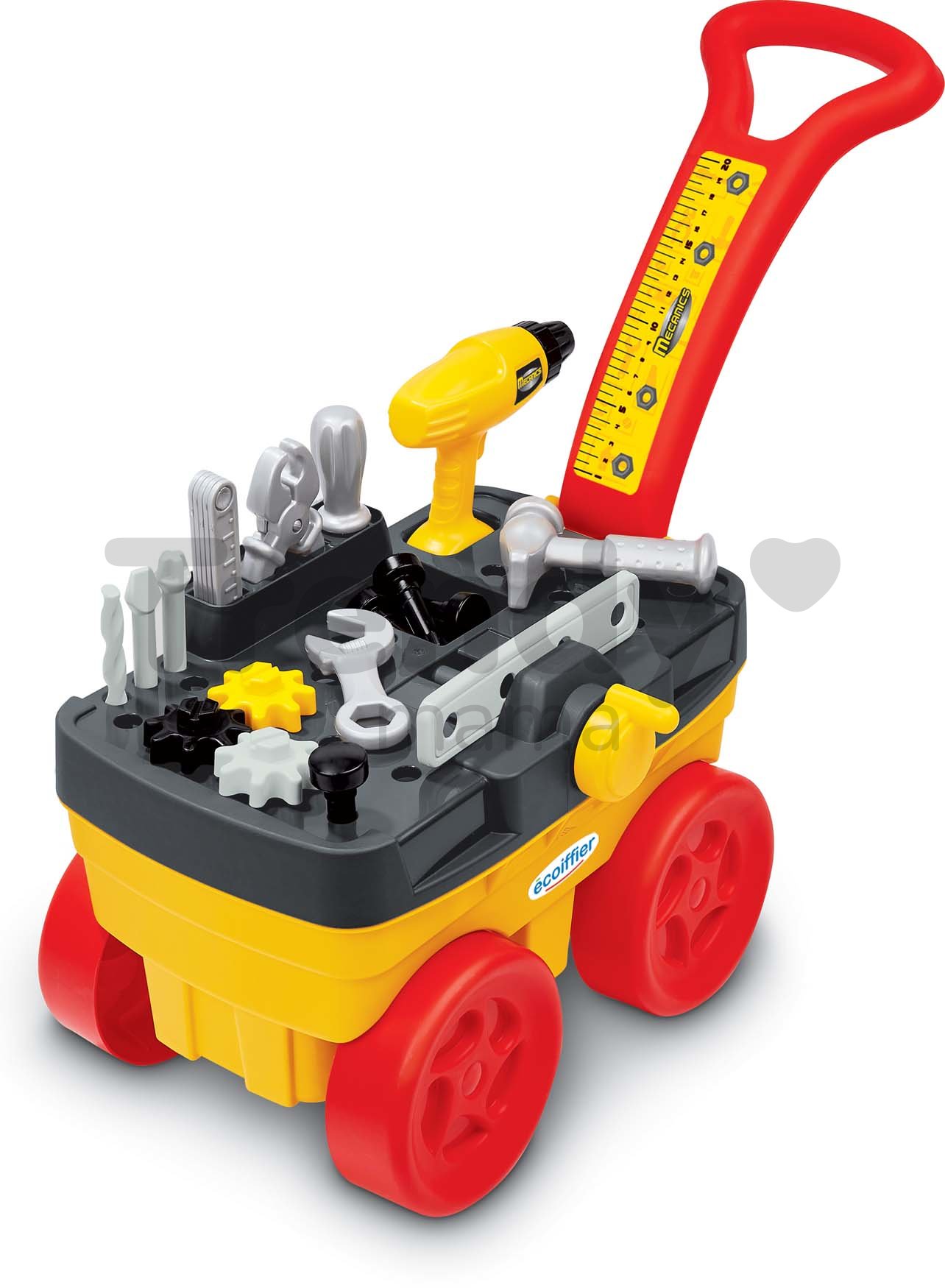 Vo vozíku je prakticky umiestnená vŕtačka, skrutkovač, kladivko, skrutky, matice, kombinačky či francúzsky kľúč. Malý kutil si môže montovať, skrutkovať, zapojiť fantáziu a za pomoci náradia vytvárať ľubovoľné tvary. Celý vozík, vrátane náradia, je vyrobený z kvalitných a odolných plastov, ktoré dlho vydržia a sú príjemné na dotyk. Je prevedený v peknej červenej a žltej farbe so sivým detailom, ktoré dodávajú vozíku sviežosť a hravosť. Náradie je vytvarované presne pre malé detské rúčky, takže ho dieťa bude vedieť správne uchopiť a hrať sa s ním.