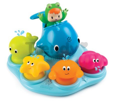 Jucăria de îmbăiere, animale cu stropitor, Cotoons de la producătorul franţuzesc, Smoby este ideală pentru hârjoneala în apă. Cele 5 animăluţe de culori vesele, împreună cu broscuţa Wabap, trăiesc pe o insulă. Jucăria, care s-a fabricat din material de plastic plăcut şi pentru apă, este potrivită pentru îmbăierea în vană sau în piscină. Pe partea inferioară a animăluţelor se găseşte o ventuză cu ajutorul căreia jucăriile se pot lipi pe peretele băii sau a vanei. Apăsând animalul pe cap, printr-o gaură, acesta va stropi cu apă pentru o distracție mai mare. Ca un accesoriu interesant este suportul albastru în formă de insulă, pe care își are locul fiecare animal. Regina insulei este balena uriaşă albastră, iar în jurul acesteia se distrează ceilalți: balena verde, racul portocaliu, steaua de mare galbenă şi meduza roză.